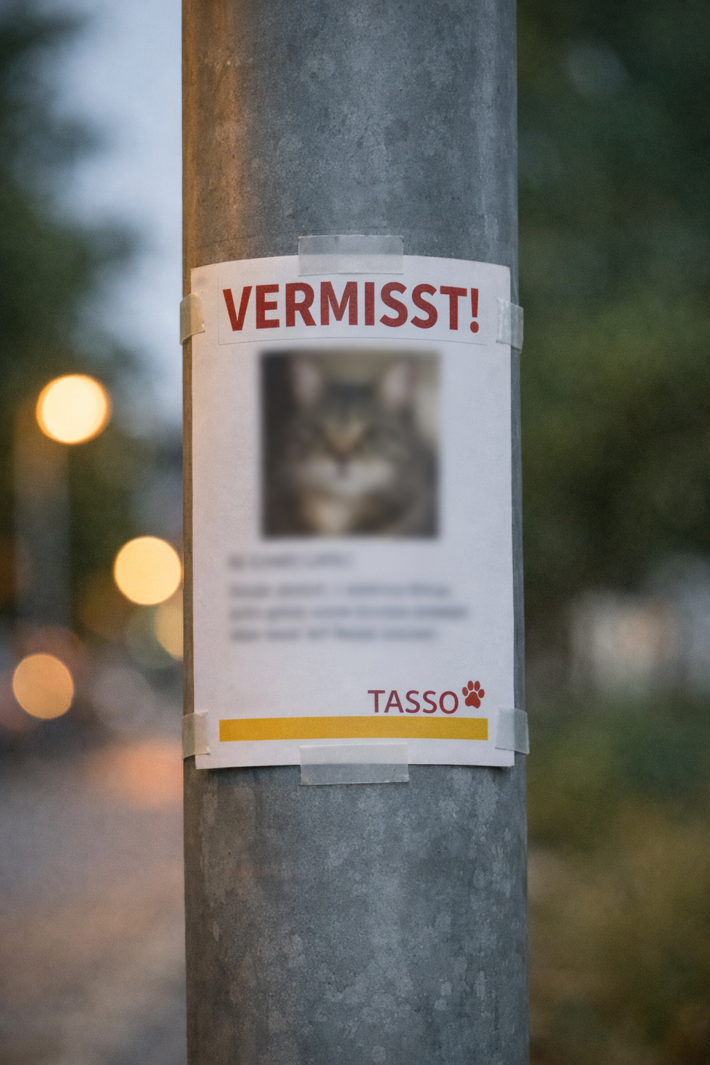 Halten Sie jede Sichtung Ihrer Katze sorgfältig fest. Besonders hilfreich sind Angaben zur Uhrzeit, zum genauen Ort (z. B. Straße oder Bereich) sowie eine Telefonnummer der beobachtenden Person.